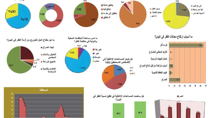 في الوقت الذي أرجعت آراء الاستطلاع أن سبب ارتفاع معدلات الفقر باليمن، 7.6 أسباب متراكمة من قبل اندلاع الصراع، 4.3 غياب الخطط التنموية، 1.1 إهمال الجهات الرسمية، 21.7% الصراع، 0.1% التزايد السكاني المتسارع، أجمع 65.2% على كل الأسباب المذكورة.