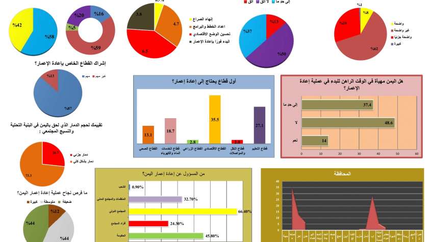 في ذات الاستبيان، الذي استهدف 58% ذكور و 42% إناث، رأى 84.6% من المُستَطلعين أن اليمن غير مهيأة في الوقت الراهن للبدء بعملية إعمار، و 37.4% إلى حدٍ ما، بينما 14% يؤكدون أنها مهيأة لإعادة الإعمار.
