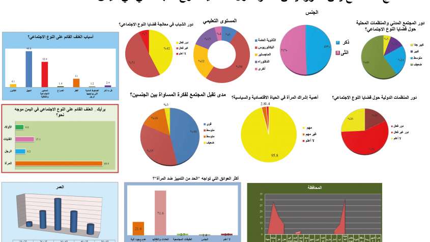 وأظهر الاستطلاع مدى تقبل المجتمع لفكرة المساواة بين الجنسين، 46% من الآراء ضعيف، 35% متوسط، %3 ضعيف، وفي حين لم يُبين 1.4% من الآراء مدى أهمية إشراك المرأة في الحياة الاقتصادية والسياسية، رأى 95.8% أنهُ مهم، 2.8% غير مهم. وخلصت نتائج الاستطلاع الإلكتروني إلى أن دور الشباب في معالجة قضايا النوع الاجتماعي، 42% دور فعّال، 51% غير فعّال، واختار 7% من المُستطلَعين موقف الحياد وأجابوا بـ “لا أعلم”.
