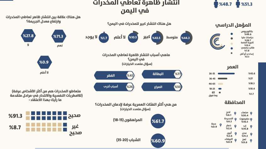 تعاني اليمن من الصراعات لأكثر من تسع سنوات حتى الآن مما أدى إلى تفاقم انتشار ظاهرة المخدرات فيها وتدهور الوضع الاجتماعي والاقتصادي بسبب هذا الانتشار. واستنادًا إلى ما سبق، أجرت وحدة المعلومات واستطلاع الرأي في “يمن انفورميشن سنتر” استطلاعًا حول انتشار ظاهرة المخدرات في اليمن؛ لدراسة مدى الضرر الذي يتسبب به انتشار المخدرات في ظل الوضع الذي تعاني منه اليمن.