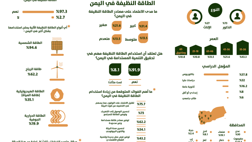 على إثر هذا كله، وللحصول على إجابات أكثر شمولًا، أجرت وحدة المعلومات واستطلاع الرأي في “يمن إنفورميشن سنتر” استطلاعَ رأيٍ تحت عنوان “الطاقة النظيفة في اليمن”. هَدَفَ الاستطلاع إلى جمع آراء عينةٍ من المجتمع اليمني حول أهمية بدء الاعتماد بشكل كامل على الطاقة النظيفة.