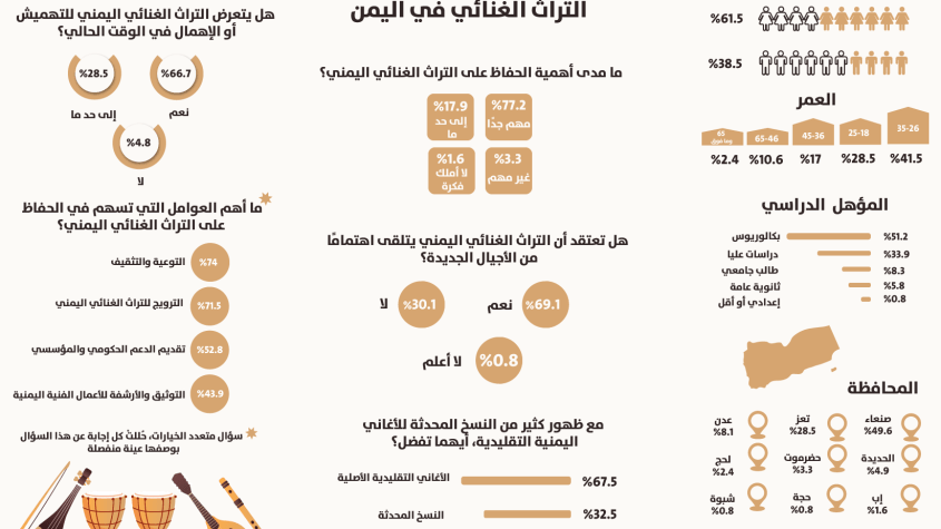 على إثر ذلك، نفذت وحدة المعلومات واستطلاع الرأي بـ”يمن إنفورميشن سنتر” استطلاعَ رأي بعنوان (التراث الغنائي في اليمن)؛ لمعرفة آراء عينة من المجتمع اليمني حول الأمر ومعرفة مدى أهميته في عكس الثقافة اليمنية.
