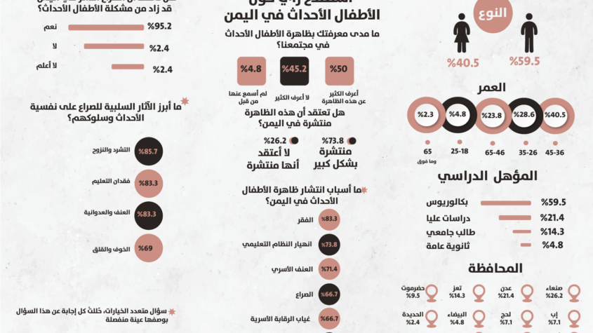 على إثر هذا كله قامت وحدة المعلومات واستطلاع الرأي في يمن إنفورميشن سنتر بعمل استطلاع رأي بشأن (الأطفال الأحداث في اليمن) لدراسة آراء عينة من المجتمع اليمني بشأن المعاناة التي يعيشها أطفال الأحداث في اليمن في ظل استمرار الصراع والأزمة الإنسانية.